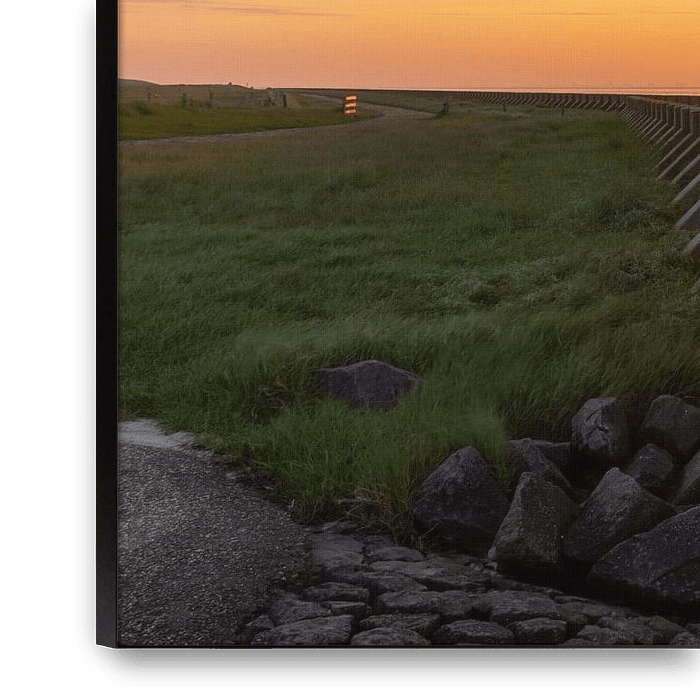 Ein Deich im Wattenmeer von Wieringen, der das dahinter liegende Land vor dem Wasser schützt. Kombiniert mit einem Sonnenuntergang mit schönen holländischen Wolkenlandschaften ergibt dies ein schönes Bild.