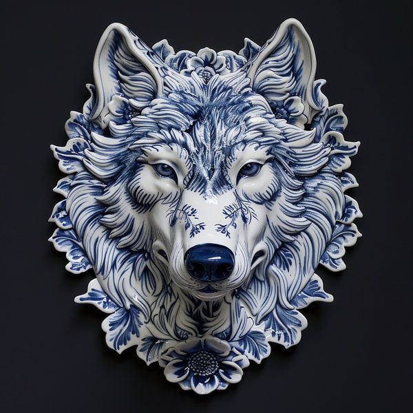 Bestelle das digitale Kunst Bild Delft Blue Wolf Wappen von Christian Ovís als Reproduktion auf Leinwand, Alu-Dibond, als Poster, Fototapete oder Acrylglasbild.