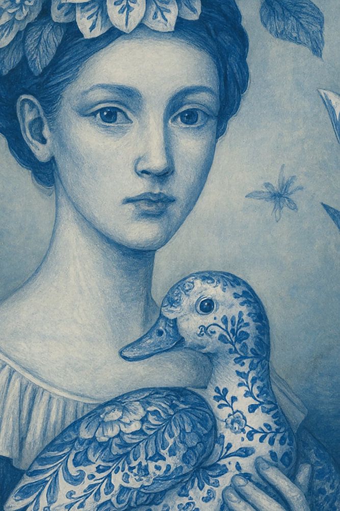 Ein poetisches und raffiniertes Porträt im Delfter Blau-Stil. Die junge Frau hält eine kunstvoll gemalte Ente, umgeben von Blumen und einer klassischen Vase. Das Werk strahlt sowohl Eleganz als auch einen Hauch von märchenhafter Symbolik aus, ideal für ein stilvolles Interieur.