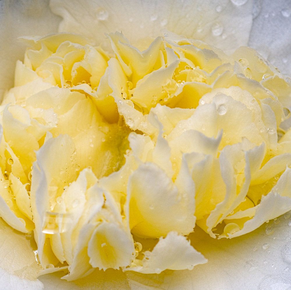 Die zarten Blütenblätter dieser Blüte ähneln am meisten der Faltung eines Wonton-Kloßes. Es hat gerade geregnet, und die Oberflächenspannung der Tropfen sorgt dafür, dass sie kugelförmig bleiben.