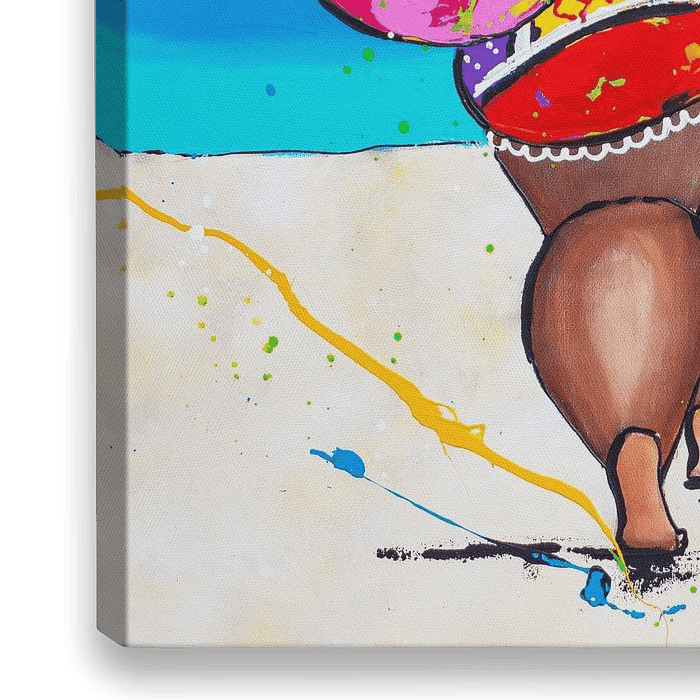 Buntes Gemälde von zwei dicken Damen am Strand von der Künstlerin Renate Rolefes. Das Originalgemälde ist 80 x 60 cm groß und mit Acryl auf Leinwand gemalt.
