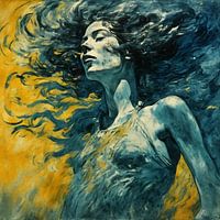 Das Gemälde fängt einen Moment purer, ungezähmter Schönheit ein - eine Frau mit einer wilden Mähne aus schwarzem und blauem Haar, die vom Wind zerzaust wird. Ihr Haar wirbelt und tanzt, jede Strähne ist lebendig und bildet einen spannenden Kontrast zu dem lebhaften Hintergrund. Der Himmel hinter ihr ist ein Meisterwerk für sich, gemalt…