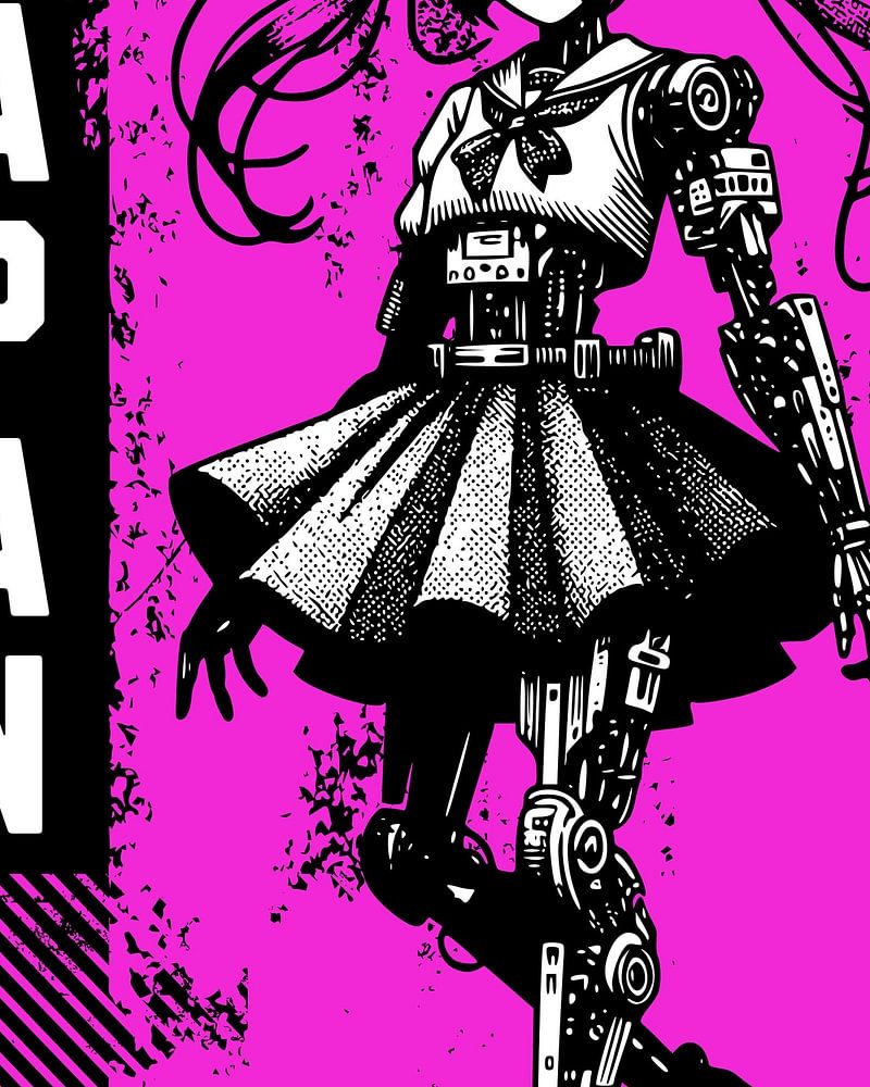 Ein lebhaftes, von Cyberpunk inspiriertes Design mit einem futuristischen Robotermädchen aus Japan in einem technikbegeisterten Outfit mit einem leuchtenden mechanischen Auge. Dieses Kunstwerk spielt im Jahr 2150 und fängt die Essenz einer Welt ein, in der Menschlichkeit und Technologie miteinander verwoben sind und die Seelen mit dem Puls der fortschrittlichen Innovation mitschwingen. Kräftige Farben und ein auffälliger Kontrast aus Pink und Schwarz unterstreichen das Thema der futuristischen Erforschung und der endlosen Möglichkeiten des digitalen Zeitalters. Perfekt für alle, die Sci-Fi, Cyberpunk und japanisch inspirierte Designs lieben.