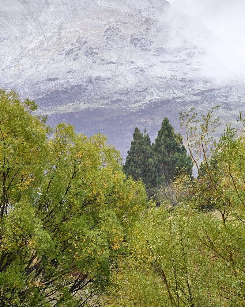 Eine malerische Landschaft mit Bäumen und nebligen Bergen in Neuseeland