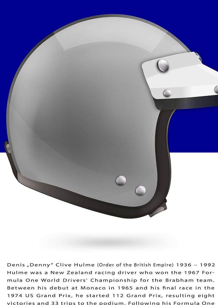 Druckgrafik mit den persönlichen Sturzhelmen berühmter Rennfahrer der 1950er und 1960er Jahre.