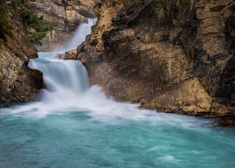 Ein doppelter Wasserfall stürzt kraftvoll durch eine schmale Bergschlucht, von oben nach unten in Stufen. Das Wasser hat eine hellblaue, türkisfarbene Farbe, typisch für Gletscher- oder Bergwasser. Die Umgebung besteht aus steilen Felswänden, zerklüftet und verwittert, mit einigen grünen Nadelbäumen an der Spitze.