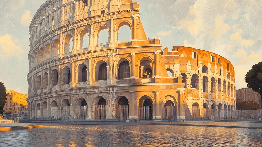 Das Kolosseum ist in sanftes, pfirsichfarbenes Licht getaucht, als würde es nach einem langen Tag atmen. Seine runden Formen lösen sich in pastellfarbenen Blautönen und warmen Ockertönen auf. Kleine Risse und verwitterte Steine erzählen eine Geschichte von Zeit, Kampf und Schönheit.