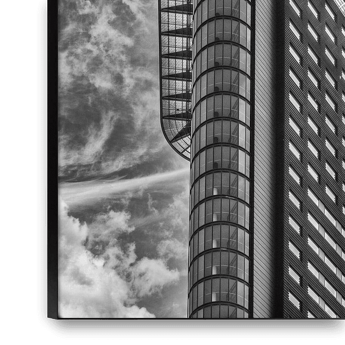 Bestelle das Foto Der Bau des Bügeleisens in Den Haag - schwarz und weiß von Hans Vos Fotografie als Reproduktion auf Leinwand, Alu-Dibond, als Poster, Fototapete oder Acrylglasbild.