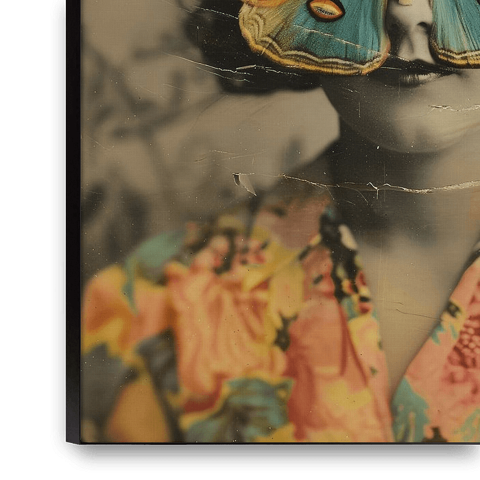 Dieses bezaubernde, alte Kunstwerk zeigt eine handkolorierte Fotografie aus den 30er Jahren, die eine Frau zeigt, deren Gesicht von einem auffallend großen Schmetterling verdeckt wird.