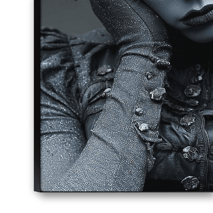 Der neutrale graue Hintergrund hebt die Textur und die Farbe der Kleider und Blumen hervor und schafft einen zeitlosen, ruhigen Look. Dieses Stück eignet sich ideal für Innenräume, die einen Hauch von Nostalgie und Raffinesse vermitteln sollen, wie z. B. Wohnzimmer, Schlafzimmer, Boutique-Hotels und Galerien.