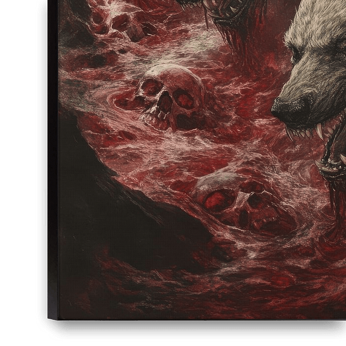 Aus den Schatten des Mythos erheben sich drei gespenstische Wölfe - Wächter eines verfluchten Tals, in dem der Fluss rot vom Blut der Verdammten fließt. Ihr Fell, bleich wie Knochen und befleckt mit Rache, fließt wie Rauch im Sturm. Diese eindringliche Vision verbindet nordisch inspirierte Überlieferungen mit Horror-Fantasy und fängt…