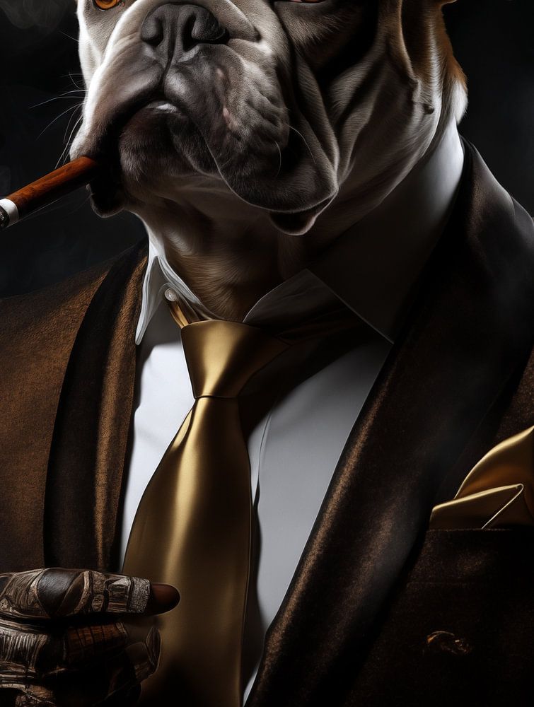 Porträt einer zähen Bulldogge in einem schicken Anzug mit goldener Krawatte, die auf schwarzem Hintergrund eine Zigarre raucht.