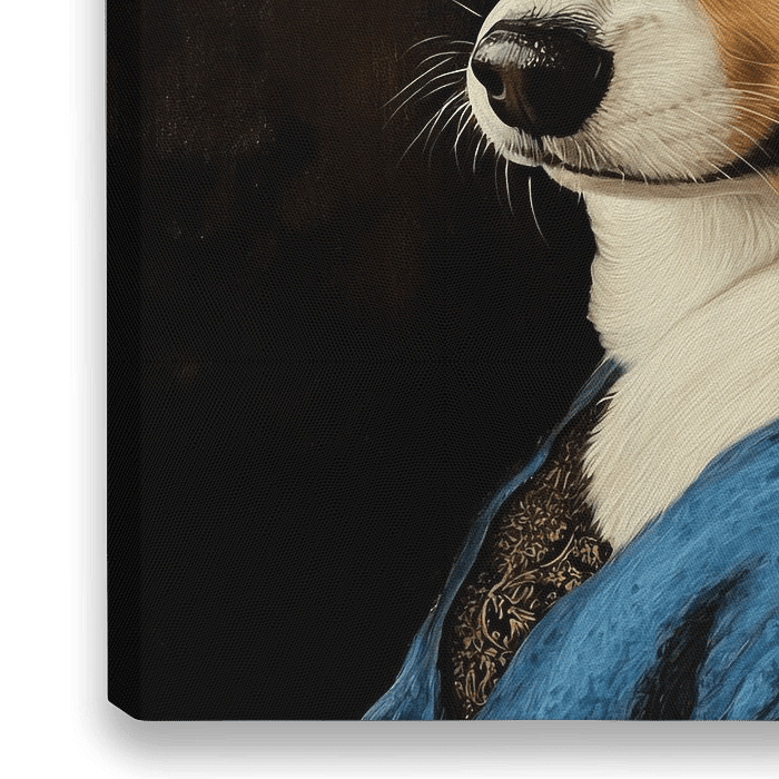 Dieses humorvolle Ölgemälde ist eine skurrile Variante von Vermeers Das Mädchen mit dem Perlenohrring und ersetzt das Gesicht des Mädchens durch das eines ausdrucksstarken Corgis. Der Corgi mit seinen kultigen Ohren und seinem verspielten Grinsen trägt das bekannte Kopftuch und den übergroßen Perlenohrring und verbindet klassische…