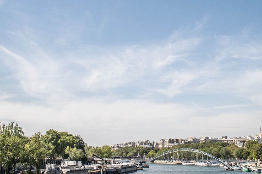 Der Eiffelturm von der Seine aus. Ein schöner Blick auf den Eifelturm von einer Brücke über die Seine. Großartige Lage, um das Meisterwerk von hier aus zu sehen.