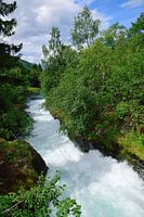 Nachdem wir den Lofossen-Wasserfall auf der anderen Seite der Brücke, auf der wir stehen, gesehen hatten, konnten wir den Fluss Loelva sehen, der sich in der Nähe der Stadt Loen in Norwegen fortsetzt. Das Wasser war wirklich wild.
