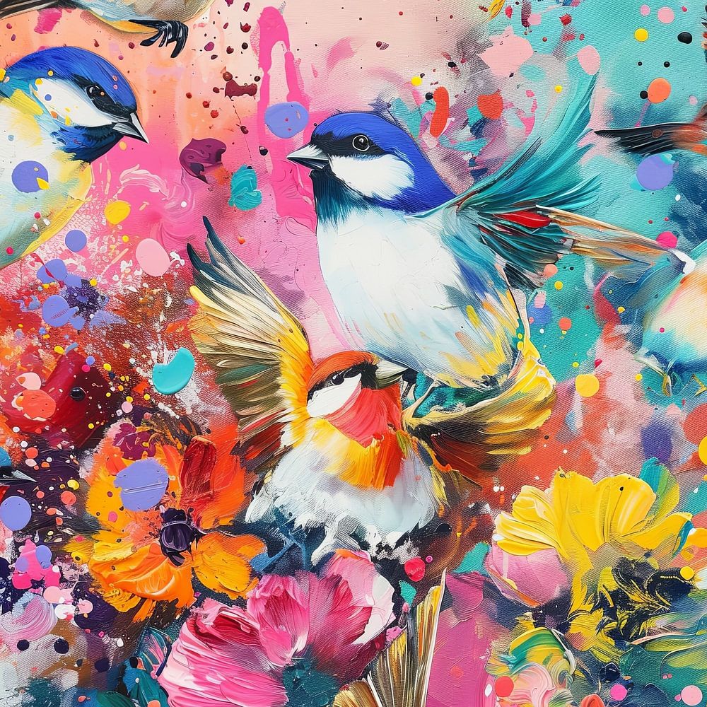 Ein lebhaftes und farbenfrohes Kunstwerk, das die Frische des Frühlings verkörpert. Es ist eine Explosion verschiedener Farben, die in einer ausdrucksstarken und agilen Weise aufgetragen werden, mit einer Anspielung auf die Technik der "Splash Art". Das Vogelmotiv erinnert an die blühende Natur und die Freiheit des Himmels, was zu einem fröhlichen und lebendigen Gefühl von Farbe und Frühling führt.