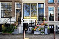 Auf der Prinsengracht in Amsterdam hat der Frühling begonnen. Die Bewohner des Kanalhauses mit einem originellen Treppenhaus schmückten den Eingang mit großen Blumentöpfen voller gelber und roter Tulpen und Narzissen. Es sind mehrere Versionen dieses Werks verfügbar.