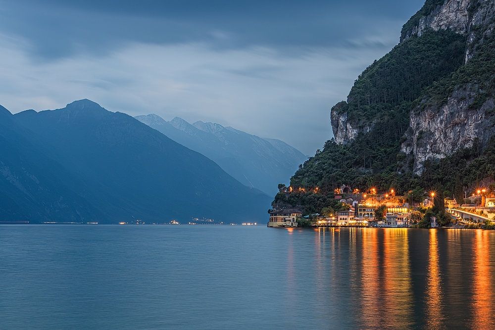 Professionell aufgenommen in der blauen Stunde, wenn sich der Himmel in dramatische Farbtöne hüllt und das Wasser mit Farben und Kontrasten zum Leben erwacht. Eine einzigartige Komposition dank des Zusammenspiels von Natur und Kultur, Wasser und Stadtlichtern, Ruhe und Dramatik. Perfekt für Innenräume mit einer Leidenschaft für Reisen, Italien, Fotografie oder Berglandschaften, als Wanddekoration im Wohnzimmer, Büro oder Ferienhaus.