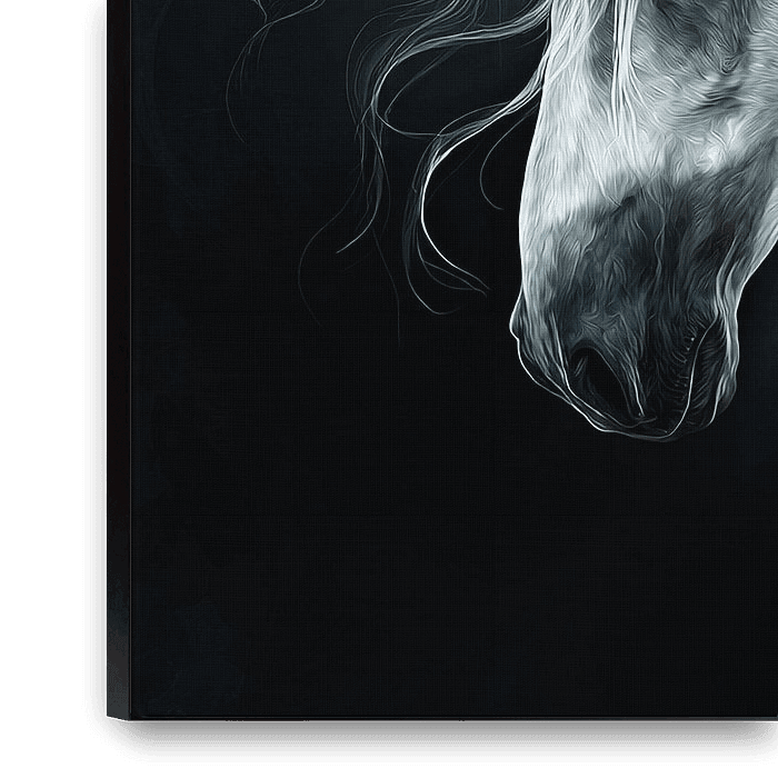 Mysteriöses und majestätisches Porträt eines weißen Pferdes mit flatternder Mähne und dezenten Goldakzenten vor dunklem Hintergrund, ideal als zauberhafte Wanddekoration.
