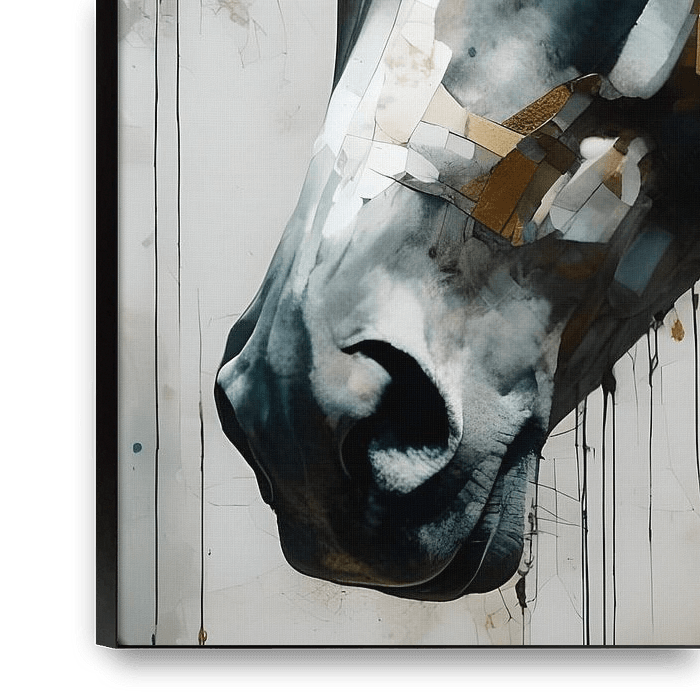 Bei der digitalen Darstellung eines Pferdekopfes werden abstrakte geometrische Formen mit realistischeren Details kombiniert. Braun-, Gold- und Grautöne werden verwendet, um einen dynamischen und fragmentierten Effekt zu erzeugen, der dem Werk ein Gefühl von Bewegung verleiht.