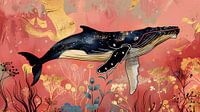 Dieses Kunstwerk zeigt einen majestätischen Wal, der durch eine surreale, korallenfarbene Unterwasserlandschaft gleitet.