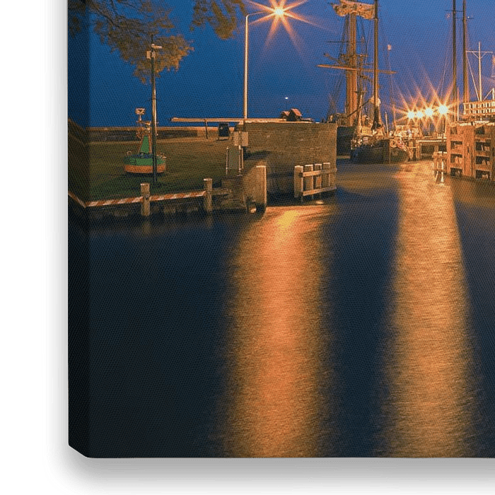 Dämmerung in Hoorn, Nordholland, mit dem Hoofdtoren in Hafennähe im Hintergrund. Der Hoofdtoren ist eines der letzten erhaltenen Verteidigungswerke im nordholländischen Hoorn.