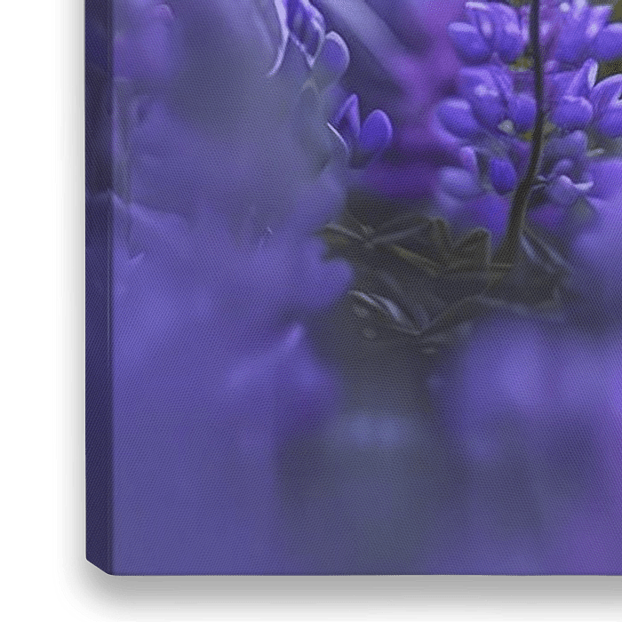 Das Kunstwerk zeigt eine Nahaufnahme eines weißen Schneehasen, der friedlich inmitten eines üppigen Meeres aus lila Lupinenblüten schläft.