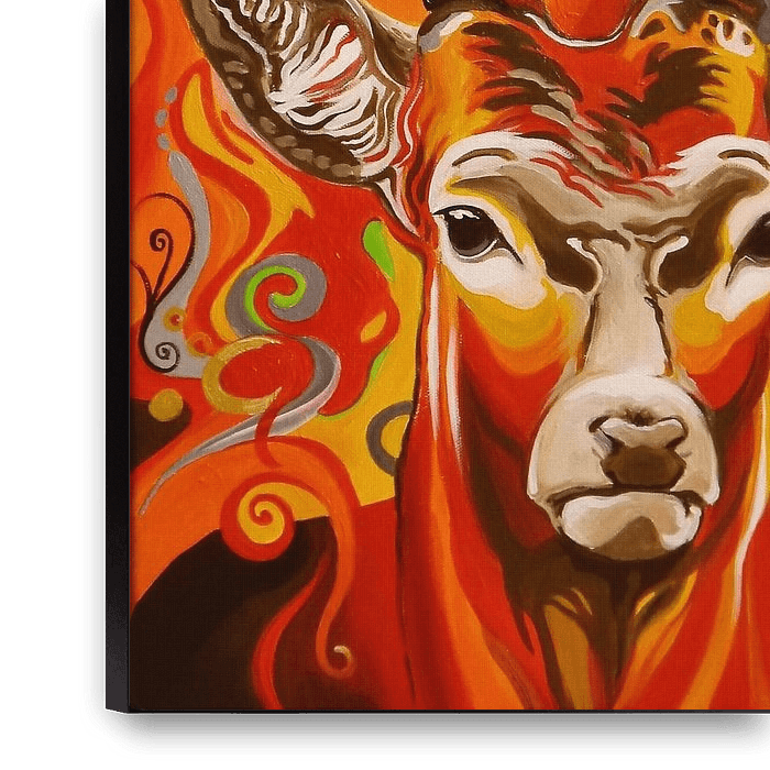 Nordische Mythologie: Der Hirsch "Eikthyrnir" ist ein zentrales Wesen in Walhall, wo er das Laub des Weltenbaumes Lärad frisst. Das Gemälde zeigt einen majestätischen Hirsch mit einem prächtigen Geweih, der in lebhaften, leuchtenden Farben dargestellt ist. Die dominierenden Farben sind Rot, Orange und Gelb, die einen starken Kontrast zu…