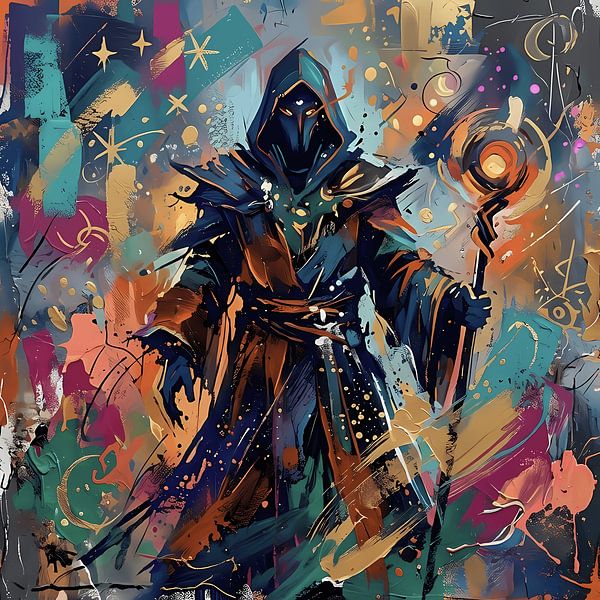 Ein kraftvolles Fantasy‑Kunstwerk, das eine mystische, verhüllte Gestalt mit leuchtendem Stab vor einem explosiven Wirbel aus Farben und Symbolen zeigt. Die dynamische Mischung aus Blau, Orange, Gelb und Violett erzeugt eine magische, energiegeladene Atmosphäre. Ideal für Fans von Fantasy‑Welten, spiritueller Symbolik und moderner,…
