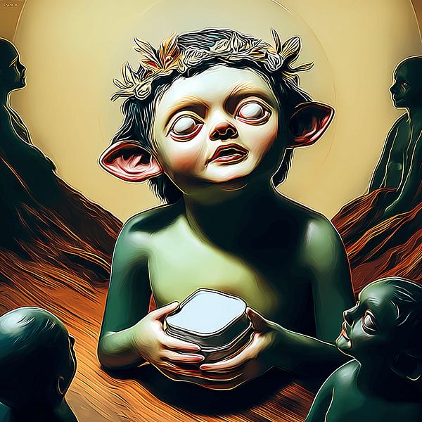 In einem ruhigen, überirdischen Schein steht eine kindliche Gestalt inmitten einer vergessenen Gemeinde und hält ein leuchtendes Objekt in den Armen, das sowohl uralt als auch futuristisch wirkt. Ihre Augen – leer und doch wissend – deuten auf eine Verbindung hin, die über Sprache hinausgeht, während die umstehenden Figuren stille…