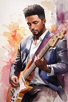 Digitale Zeichnung im Anime- und Aquarellstil eines Jazz-Bassisten.