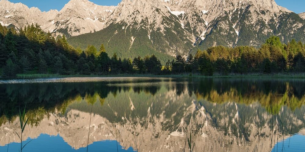 Das Karwendelgebirge spiegelt sich in einem glasklaren Bergsee in der Nähe von Mittenwald, Oberbayern, Deutschland