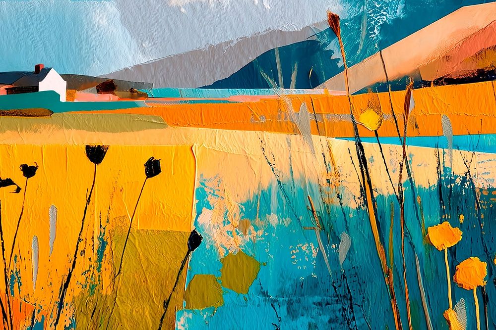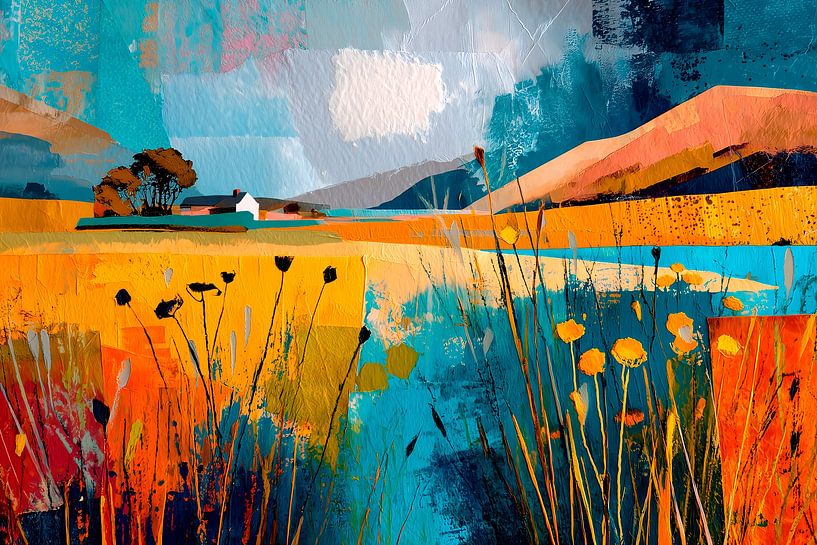 Ein modernes abstraktes Kunstwerk einer hügeligen Landschaft, in deren Vordergrund hohe wogende Gräser und Wildblumen für Tiefe und Textur sorgen. In der Mitte des Bildes steht ein malerisches weißes Häuschen zwischen dunkelgrünen Baumgruppen im Mittelpunkt. Der Hintergrund besteht aus sanft geschwungenen Hügeln in Orange- und…