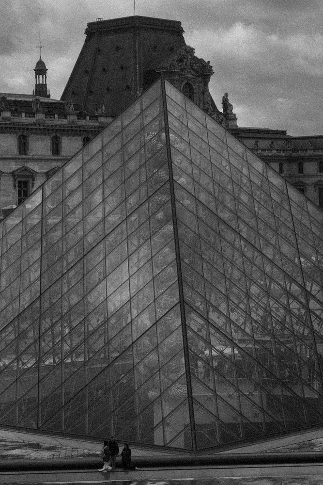 Der Louvre in Schwarz-Weiß in Paris an einem bewölkten Tag.