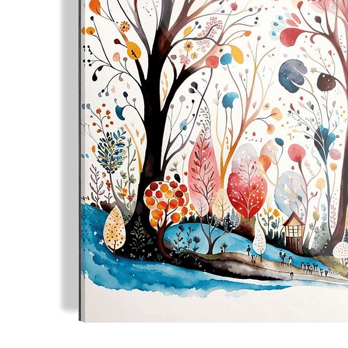 Dieses Kunstwerk ist eine lebendige und fantasievolle Darstellung einer Landschaft, die direkt einem Traum entsprungen zu sein scheint. Zwei üppige Bäume mit farbenfrohen Blüten und seltsamen Früchten stehen wie Wächter auf beiden Seiten eines Flusses, der durch ein magisches Dorf fließt. Die Flora in dieser Szene folgt keinen bekannten Naturgesetzen; Blumen und Pflanzen tauchen in ungewöhnlichen Formen und Größen auf, in einem Spektrum von zarten Pastellfarben bis hin zu leuchtenden Tönen. Das Bild erinnert an die Fantasie eines Kindes, voller Freude und Wunder. Kleine Häuser mit spitzen Dächern schmiegen sich zwischen die Pflanzen und vermitteln den Eindruck einer Gemeinschaft, die in Harmonie mit der Natur lebt. Das Ganze ist eine Ode an die Kreativität und die natürliche Schönheit, eine Einladung, sich der Fantasie hinzugeben.