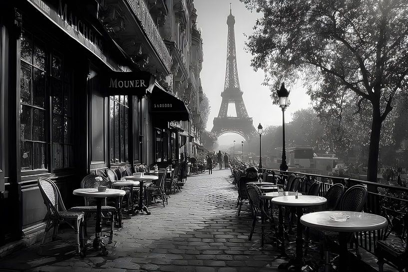 Ein Straßencafé im frühen Morgenlicht, irgendwo in Paris, 1935. Die Stühle noch leer, die Tische unberührt – als hätte die Nacht sie eben erst freigegeben. Der Dampf des ersten Kaffees hängt noch schwer in der kühlen Luft. Im Hintergrund erhebt sich der Eiffelturm, schemenhaft im Dunst, als stiller Beobachter einer Stadt, die langsam…