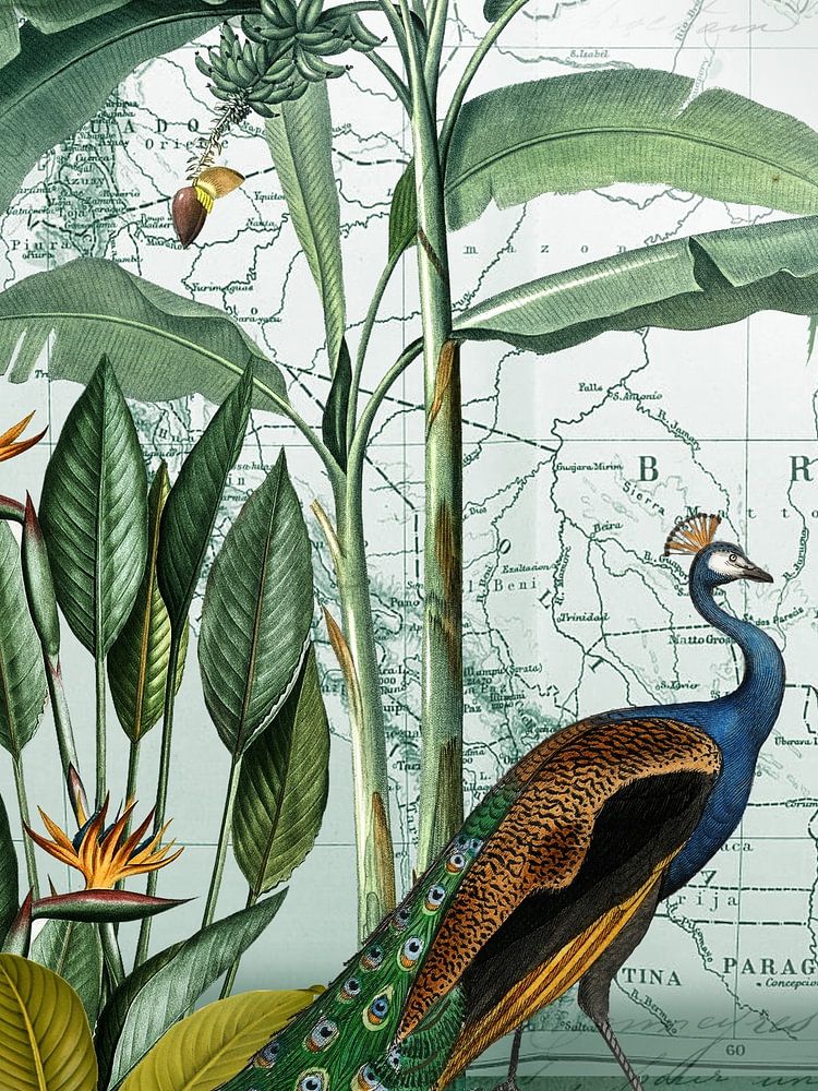 Historische Illustrationen von Tieren und exotischen Pflanzen neu arrangiert im Vintage Stil.