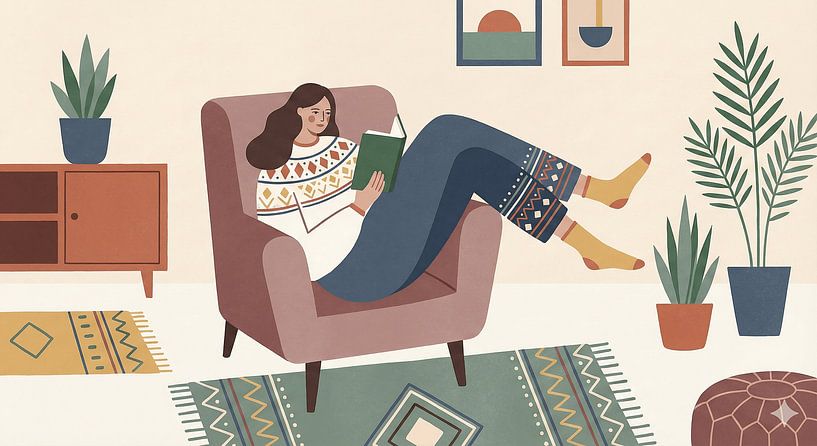 In diesem warmen Interieur streckt sich eine Frau in einem bequemen Sessel aus und vertieft sich in ein Buch. Ihre entspannte Haltung, die farbenfrohen Socken und das weiche Zusammenspiel von Mustern und Erdtönen vermitteln ein Gefühl von Gemütlichkeit und Geborgenheit. Umgeben von Pflanzen und subtilen grafischen Details strahlt das…