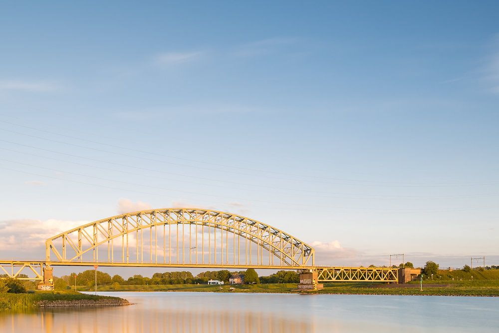 Eisenbahnbrücke über den Rhein bei Oosterbeek bei Sonnenuntergang. Die Spiegelung der Brücke im Rhein, eine kleine Wolke und Grün im Vordergrund.