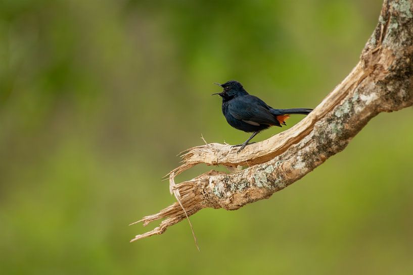 Ein stimmungsvolles Porträt einer indischen Schamaldrossel in vollem Gesang. Dieses in der Wildnis Sri Lankas aufgenommene Foto besticht durch seine minimalistische Komposition und die schönen Details des Vogels vor einem verträumten grünen Hintergrund.