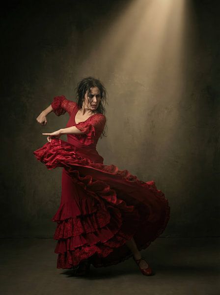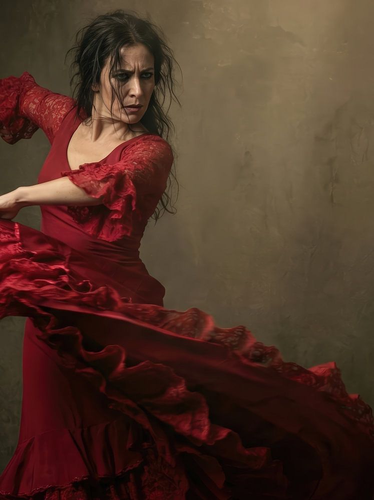 Dieses Bild zeigt keinen Tanzschritt, sondern einen Einschnitt. Der Körper der Tänzerin wirkt wie eine Klinge, die den Raum teilt – entschlossen, kontrolliert, ohne Zögern. Die Bewegung ist angehalten im Moment größter Spannung: Der Rock schlägt aus, nicht dekorativ, sondern wie eine Folge innerer Notwendigkeit.