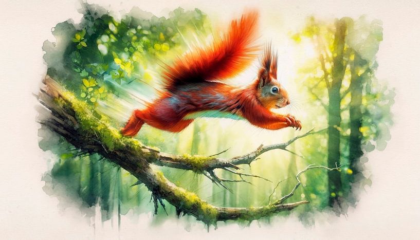 Ein Eichhörnchen springt von einem Ast. In Aquarell.
