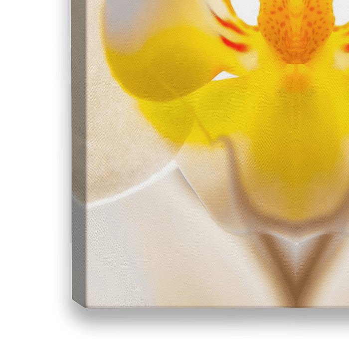 Eine Nahaufnahme eines Orchideenstößels. Es ist ein symmetrisches Foto mit viel Farbe. Das Foto ist spritzscharf und man kann alle Details der Blätter sehen.