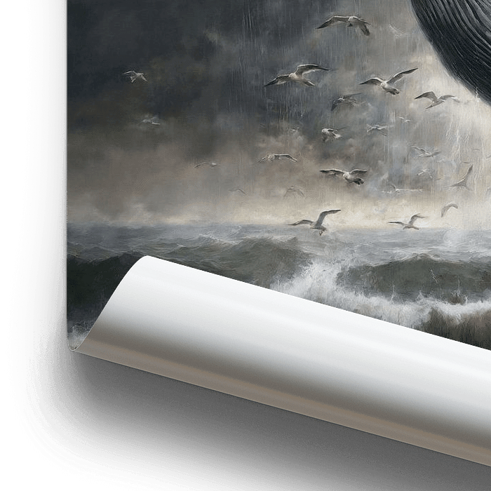 Das Kunstwerk zeigt ein Kind in einem roten Regenmantel, das an einem Strand während eines Unwetters steht. In der Szene fliegt ein Blauwal mit Segel auf seinem Rücken vorbei. Die Darstellung vereint Elemente der Fantasie und der Natur, indem das Kind und der ungewöhnliche Wal inmitten der stürmischen Umgebung harmonisch zusammenkommen.…