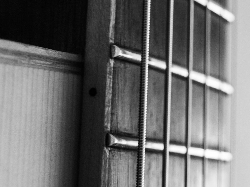 Ein Schwarzweiss-Foto einer Akustikgitarre, die an einer Wand mit dem Fokus auf dem Hals hängt, der zum Körper geht