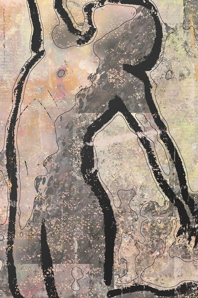 Eine Kohlezeichnung eines Mannes, der auf den Knien sitzt. Er blickt nach oben, mit einer Körperhaltung, die Verzweiflung und Wut zeigt. Diese Kohlezeichnung wurde digital koloriert und mit Textur und Details versehen.