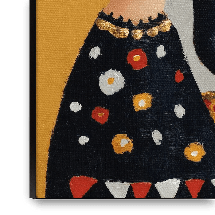 Ein warmes und skurriles Frauenporträt mit einem poetischen Detail: ein schwarzer Vogel, der ruhig auf ihrer Schulter sitzt. Die Komposition wirkt wie eine moderne Volkskunstillustration, mit einer weichen, handgemalten Textur und einer zeitlosen Farbpalette aus Ocker, Creme, Schwarz und Rot. Die goldenen Ohrringe und die subtilen…