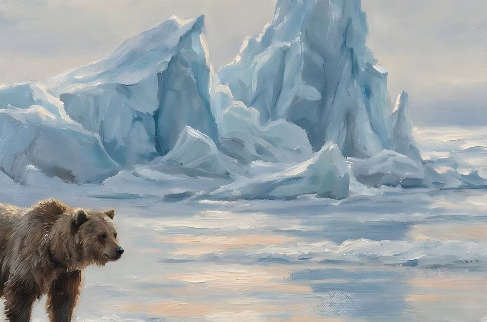 Ein beeindruckendes und stimmungsvolles Kunstwerk, auf dem ein Braunbär ruhig inmitten der weiten arktischen Landschaft steht. Das warme Braun seines Fells kontrastiert wunderschön mit dem kühlen Blau und Weiß der eis- und schneebedeckten Ebene. Das sanfte Polarlicht verleiht der Szene eine heitere, fast magische Stimmung. Gemalt im…
