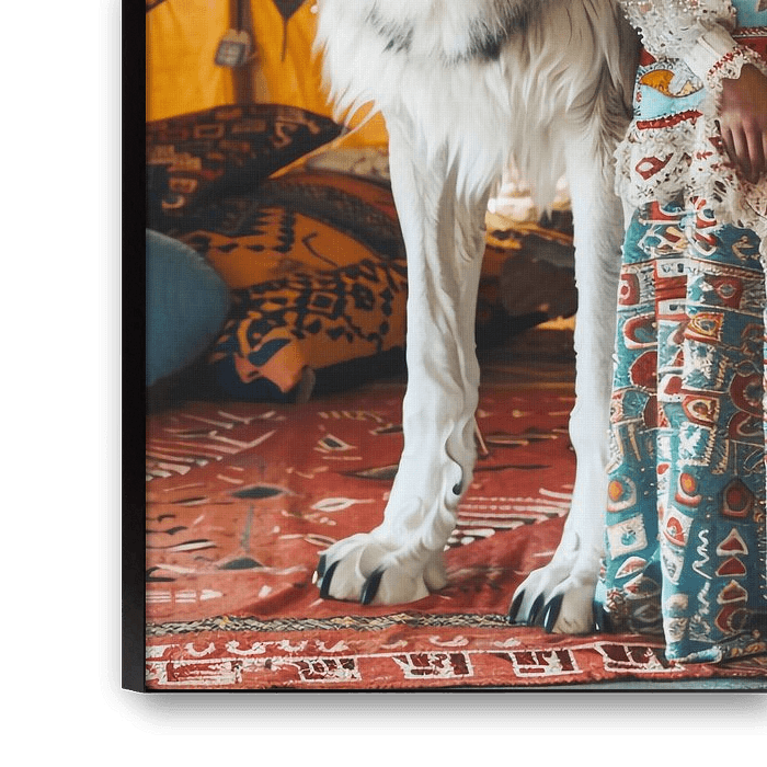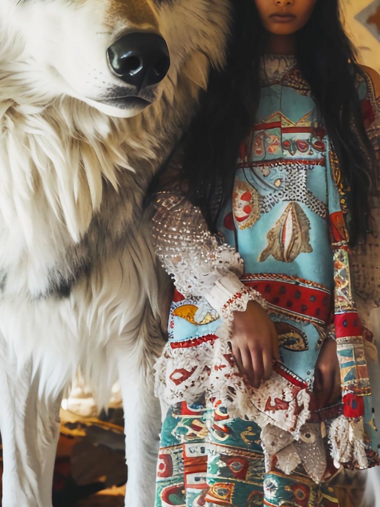 Riesenwolf mit einem Mädchen im böhmischen Kleid