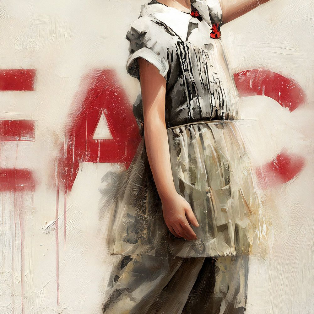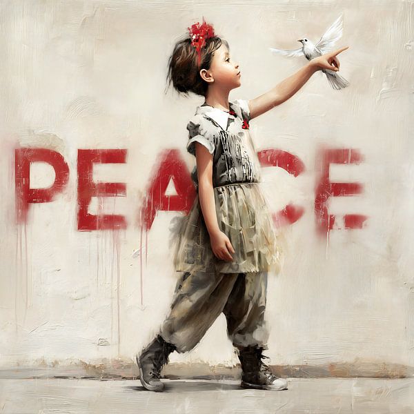 Konzeptuelle Illustration im Banksy-Stil mit einem kleinen Mädchen und einer Friedenstaube.